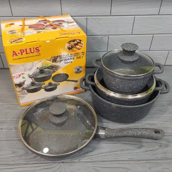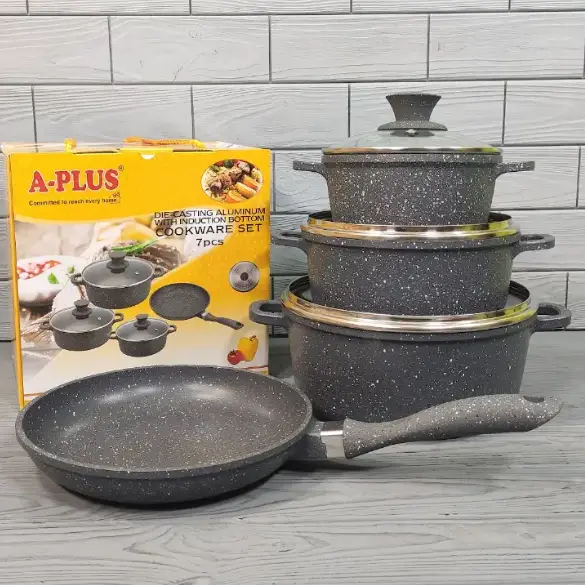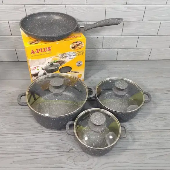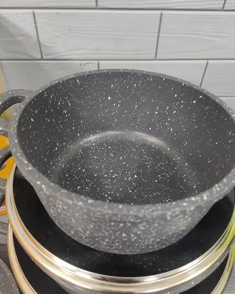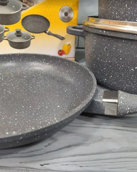 Набір посуду з високоякісного алюмінієвого сплаву та мармуровим покриттям. Спеціальне багатошарове дно забезпечує рівномірний нагрів і утримує тепло протягом тривалого часу.